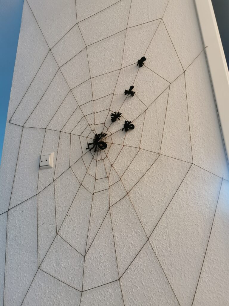 Für dieses Netz habe ich die Wolle an der Wand befestigt – ja, mit Tesa… Zugegeben, ein bisschen Plastik ist dabei, aber weit weniger als bei diesem ganzen Plastik-Gedöns aus dem Discounter. Dann die Fäden in Kreisen geknotet und schon war ein richtig schönes Spinnennetz fertig. Mit dem Knirps noch ein paar Pfeifenputzerspinnen gebastelt und ins Netz gesetzt. Wir hatten jede Menge Spaß.